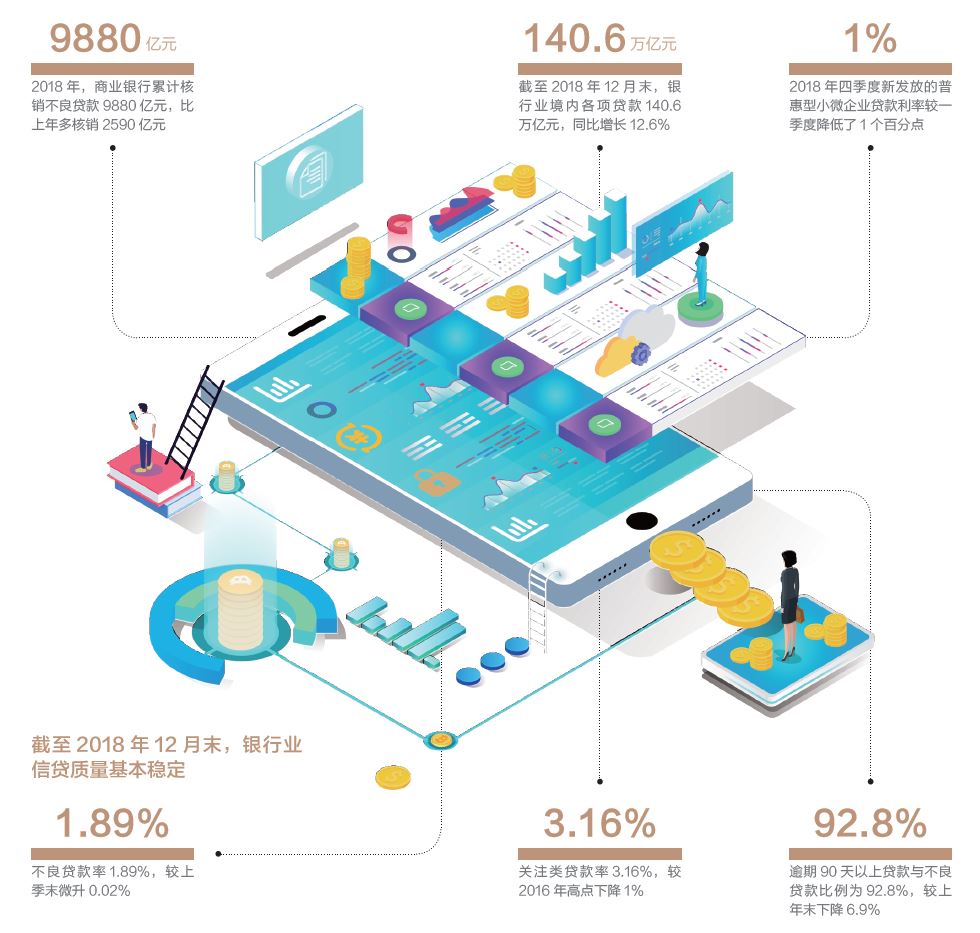 從整體上看,根據(jù)銀保監(jiān)會(huì)目前的不完全初步統(tǒng)計(jì),2018年全年,我國商業(yè)銀行共處置不良資產(chǎn)近 2 萬億元,而 2017 年的數(shù)據(jù)是 1.4 萬億元。 值得注意的是,通過核銷等措施,更多的信貸空間得以釋放,并以更廣的覆蓋面、更低的價(jià)格流向小微企業(yè)等普惠領(lǐng)域。據(jù)統(tǒng)計(jì),截至 2018 年 12 月末,銀行業(yè)境內(nèi)各項(xiàng)貸款140.6萬億元,同比增長12.6%,這一增速為近年來較高水平;2018年四季度新發(fā)放的普惠型小微企業(yè)貸款利率較一季度降低了超過 1 個(gè)百分點(diǎn)。