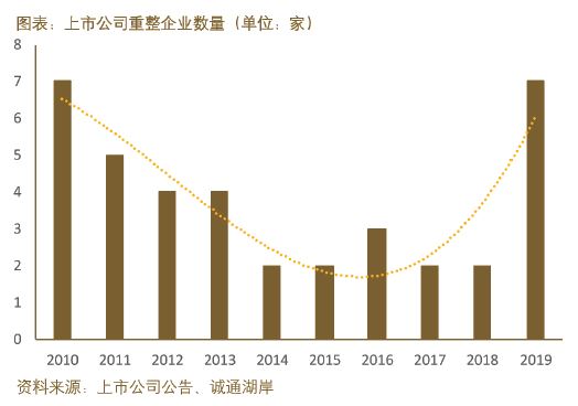 受 2007 年 -2009 年的環(huán)球金融危機影響,中國的上市公司進入重整程序的數(shù)量在 2008 年達到了一次高峰,2008年 9 家上市公司進入了重整程序。隨后幾年,這個數(shù)據(jù)逐年下降,并于 2014/2015 年達到谷底。自 2016 年開始,上市公司重整的數(shù)量有上升的跡象,截止目前 2019 年達到了 7 家。